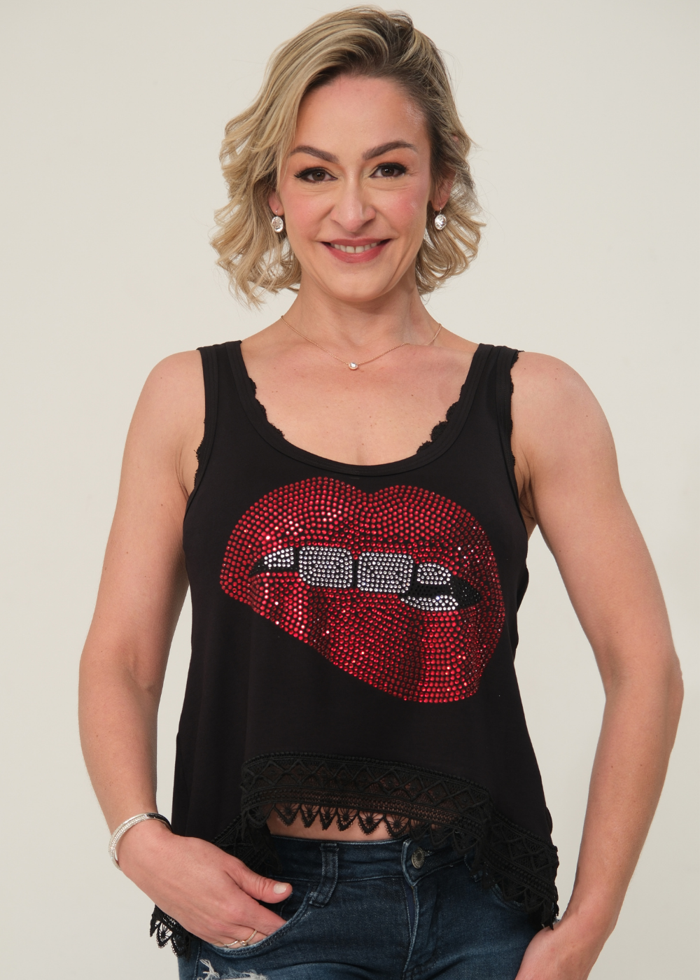 - Descrição: Regata com aplicação de pedraria crystal — combinação ideal entre conforto, acabamento refinado e brilho, perfeita com blazer, saia midi ou jeans.