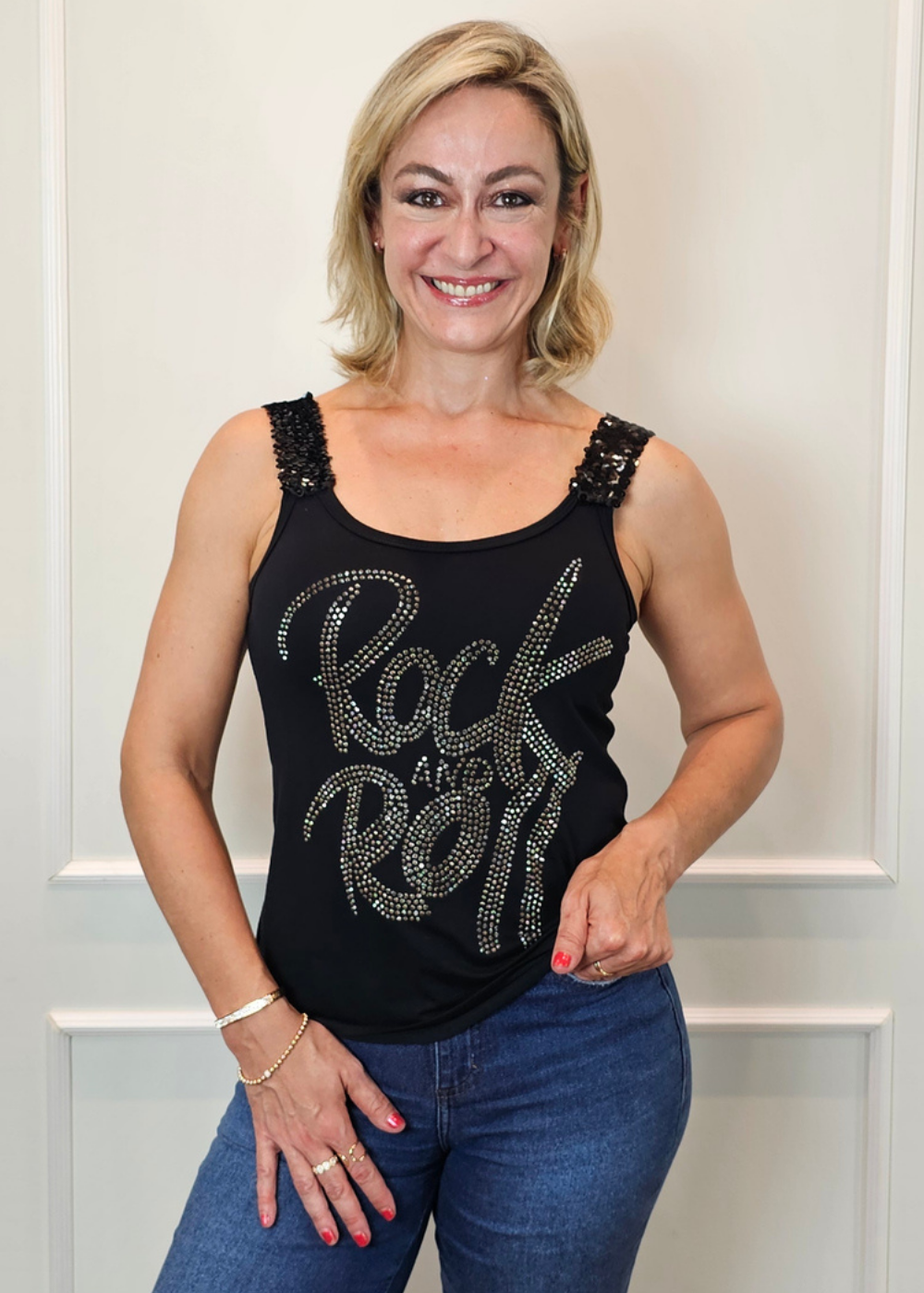 Tais Rímoli Concept | Casual Chic | Moda Comfy | Mood Comfy | Regata Rock And Roll | Camiseta Alça Paetê | Roupa Feminina que não Marca | Regata Preta Pedraria| Regata Rock| Regata pedraria| Rock and Roll | Estilo Rocker| Show de Rock