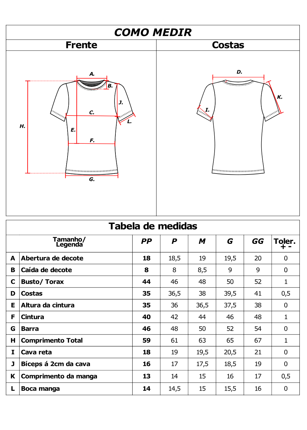 Tabela de Medidas: