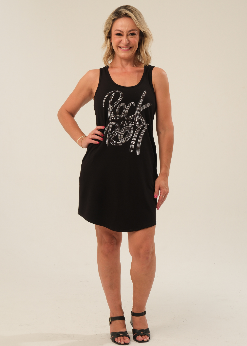 Desperte atitude com o Vestido Regata Nadador Moletinho Preto Rock And Roll Prata Pedraria! a peça autoral que une conforto absoluto e brilho na medida certa. Confeccionado em moletinho de alta gramatura (tech), oferece toque macio ao corpo, respirabilidade e caimento impecável. A estampa Rock and Roll ganha vida com aplicações de pedraria crystal estrategicamente posicionadas, garantindo aquele brilho premium.